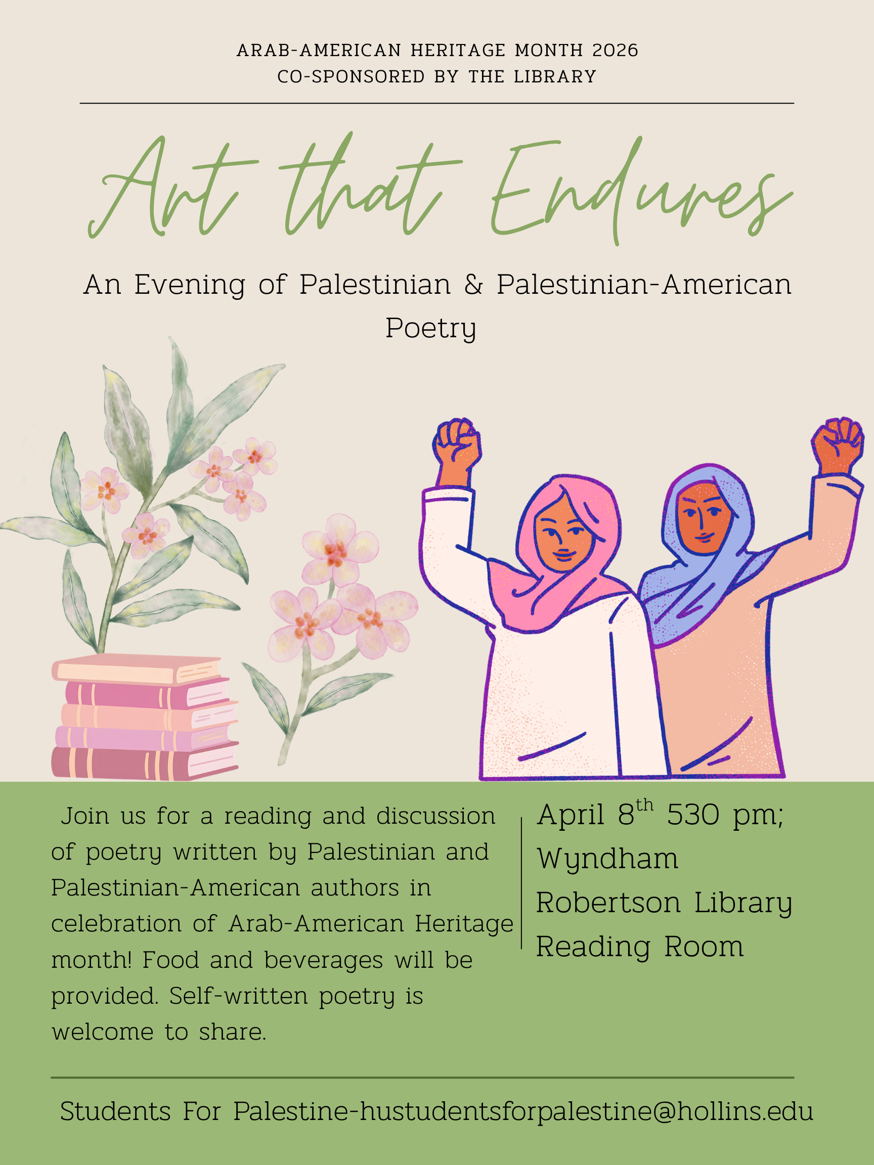 Join us for Art That Endures: a reading and discussion of poetry written by Palestinian and Palestinian-American authors in celebration of Arab-American heritage month! Self-written poetry is welcome to share.