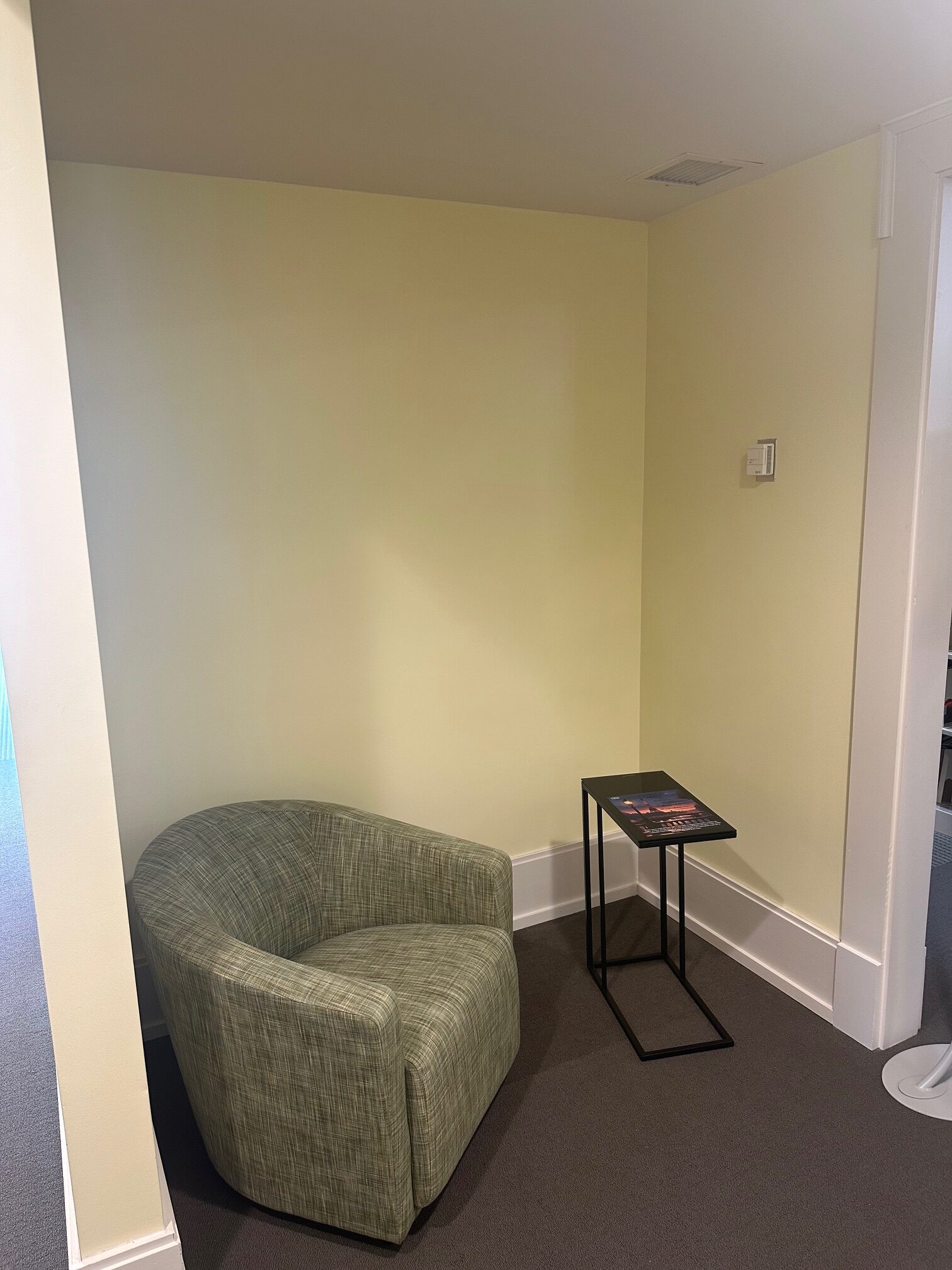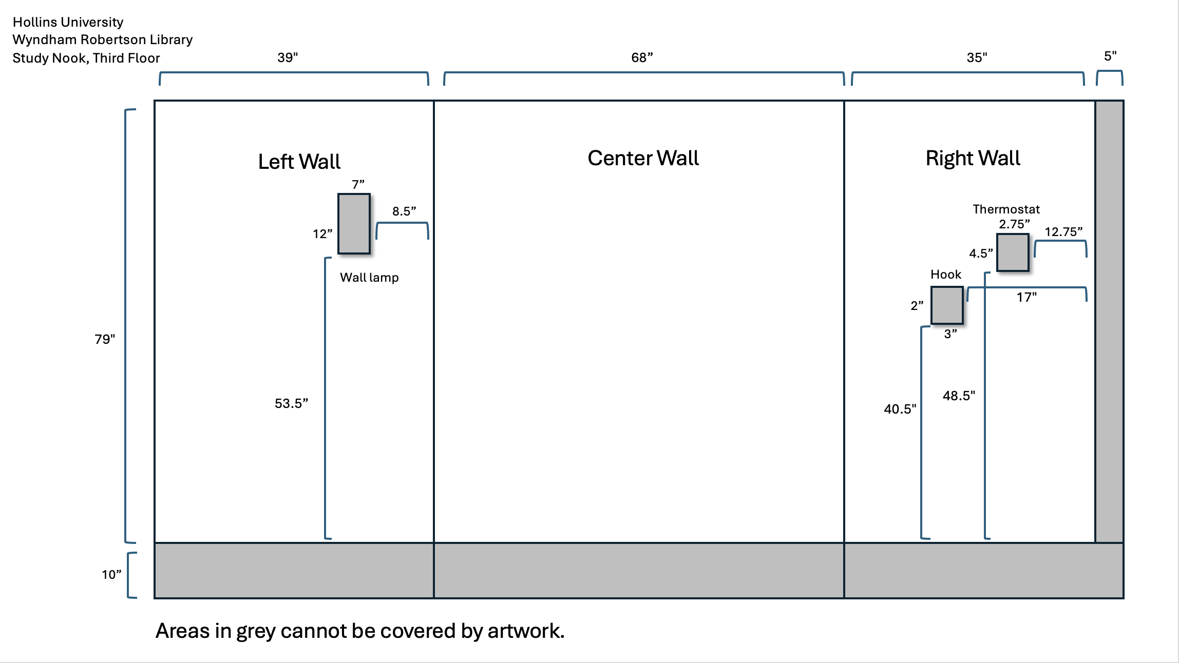We encourage artists to apply with multiple ideas, and are accepting applications that include one to three concepts for the space. Artists may utilize one to all three of the walls of the nook, and we encourage artists to use a large portion of the space. A template of the space including items attached to the wall is provided; please use this as a template for your sketch or draft design. The photograph provided includes furniture in the space. We encourage artists to visit the nook – it is in the hallway across from the water fountains.